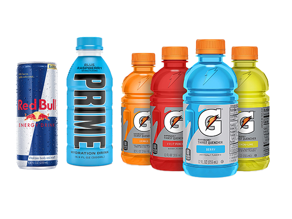 Boissons énergisantes: RedBull, Monster, Prime, Gatorade, Pepsi, 7up, Coca Cola, Sprite.